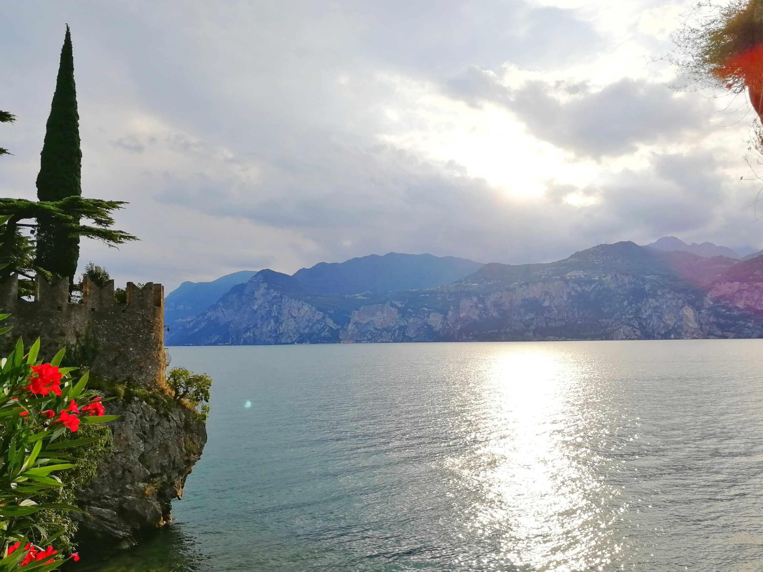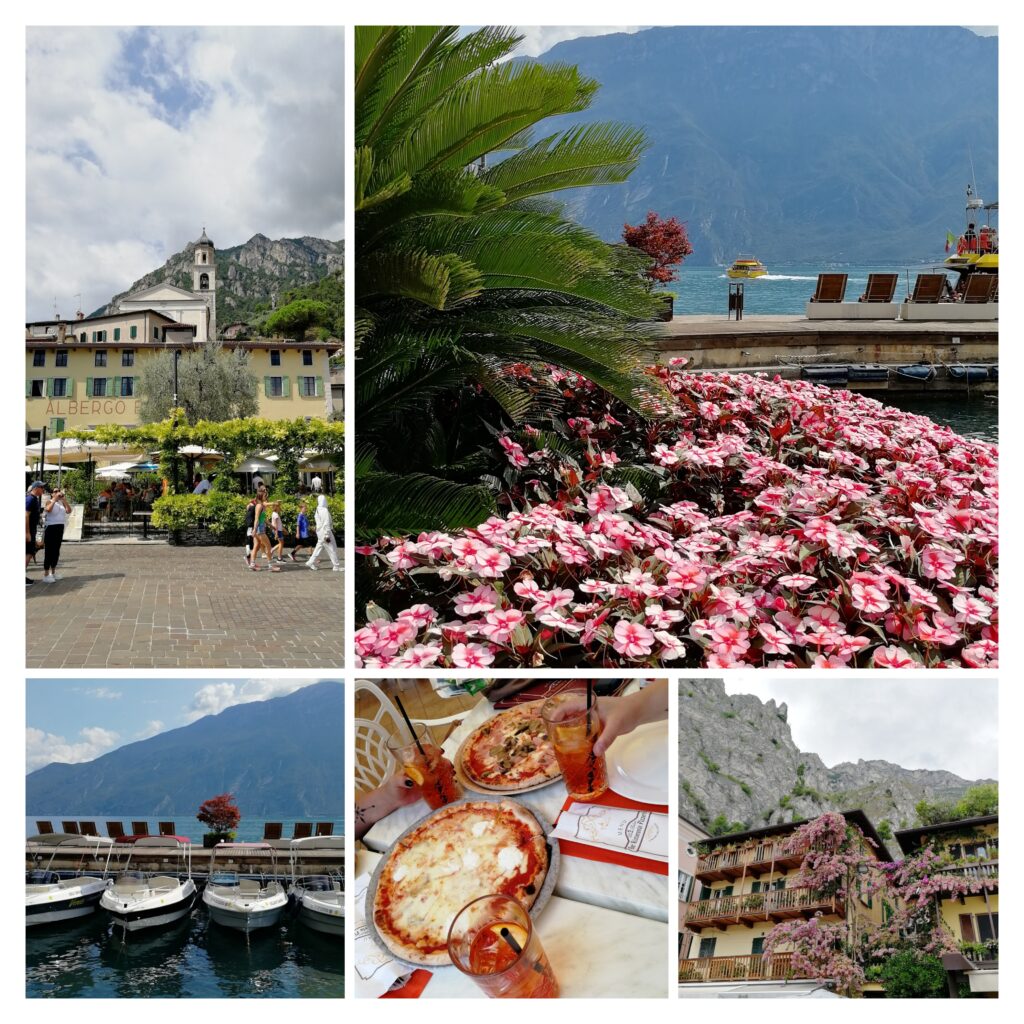 V Limone jsme si dali oběd a drink a poté pokračovali lodí do Malcesine. Nad vodou se zde tyčí skalní hrad Castello Scaligero. Můžete ho navštívit a užít si výhled na jezero. Vpravo od hradu je pláž, voda měla teplotu tak akorát na vykoupání.